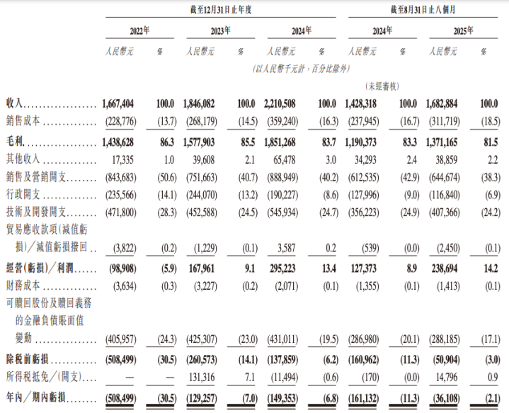 不过,情绪价值的生意并没那么容易赚钱。2022年至2024年以及2025年前8个月,Soul实现的营业收入分别为16.67亿元、18.46亿元、22.11亿元、16.83亿元;同期亏损金额分别为5.08亿元、1.29亿元、1.49亿元和0.36亿元;同期该公司经调整净溢利(非国际财务报告准则计量)分别为-0.22亿元、3.61亿元、3.37亿元、2.86亿元。